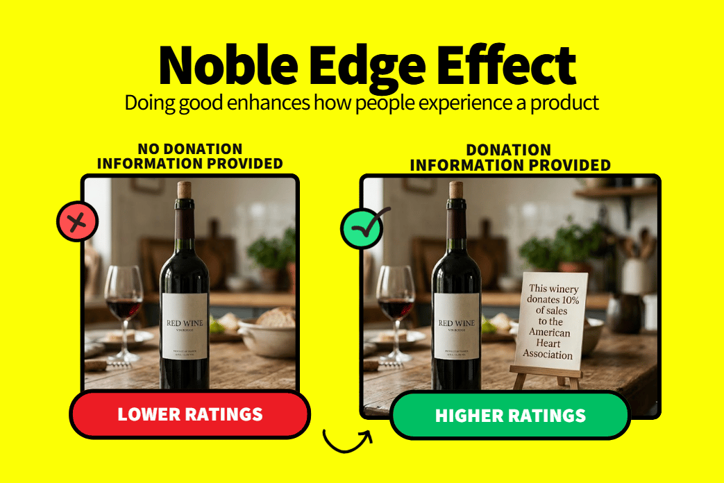 Researchers at Northwestern ran a simple wine-tasting test where participants were given the same wine. ​ Here’s the catch: ​ Some learned that the winery donated 10% of sales to the American Heart Association. The others heard nothing about donations. ​ The result? ​ ​The exact same wine got higher taste ratings when participants knew about the donations.
